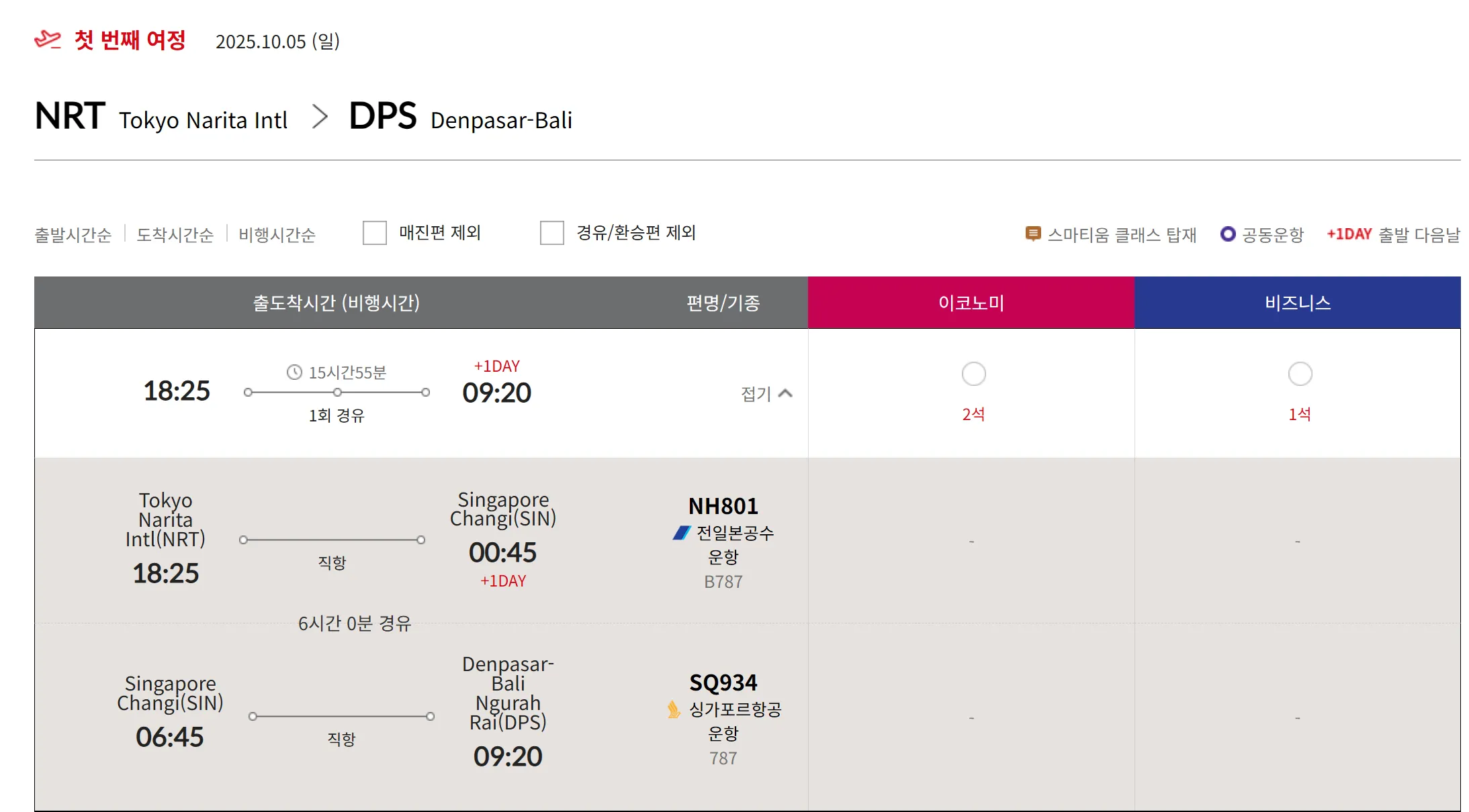 ▶ ② 나리타(NRT) → 싱가포르(SIN) → 발리(DPS) : 15 시간