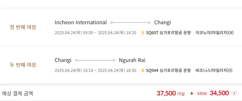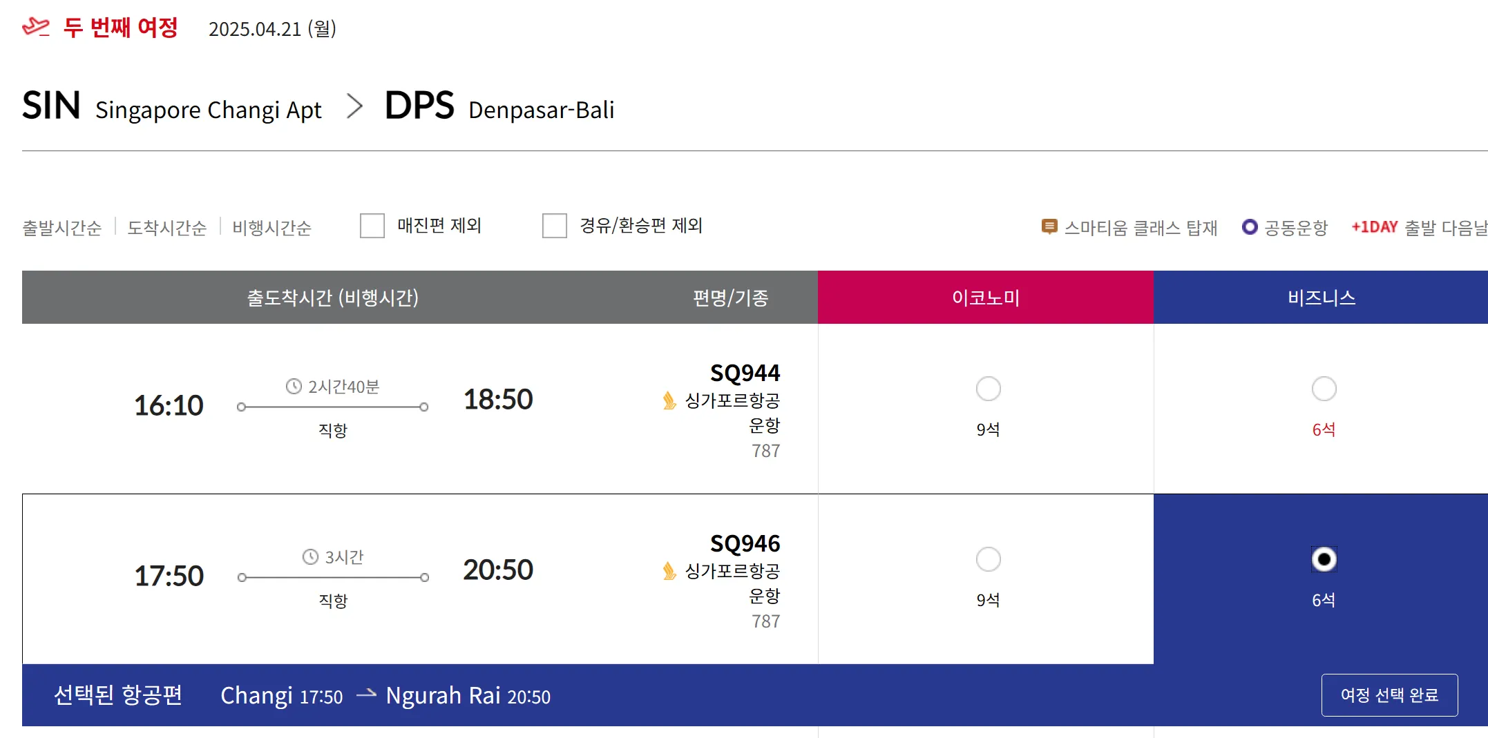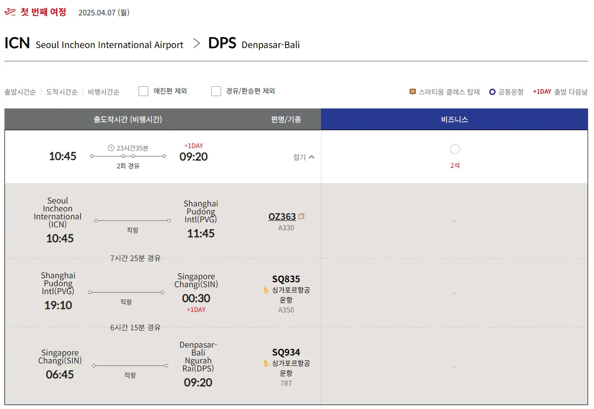 아래와 같이 인천 → 싱가포르 구간을 이코, 싱가포르 → 발리 구간을 비즈니스로 발권하기는 매우 아깝습니다.