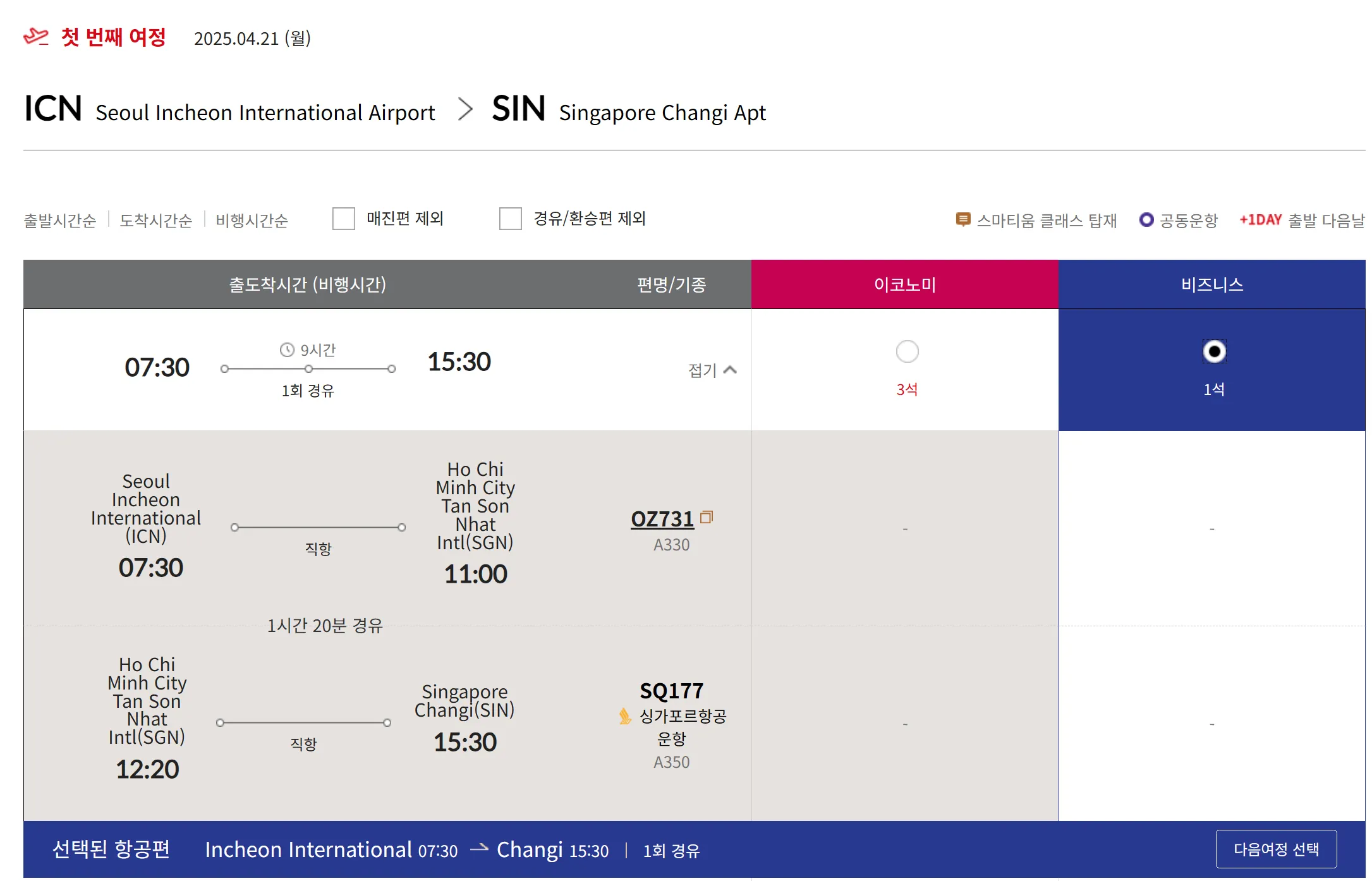 아시아나 항공에서 기존 싱가포르 여행 수요도 있어서, 비즈 좌석 잡기가 쉽지 않습니다.