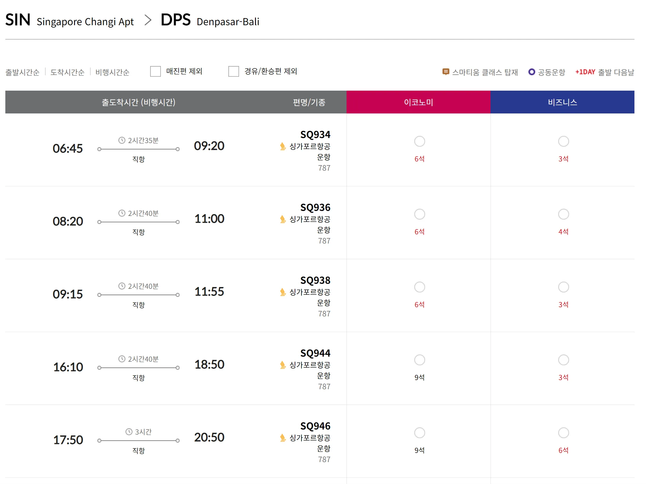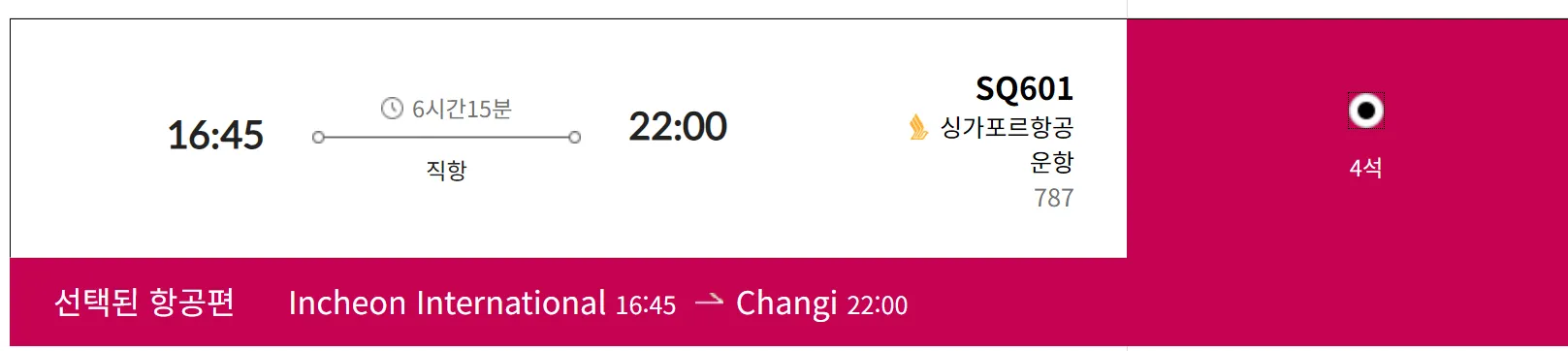 싱가포르 항공에서 스얼에 비즈 좌석을 많이 풀지만, ‘인천 ↔ 싱가포르' 은 싱가포르 항공에서 비즈 좌석을 풀지 않습니다.