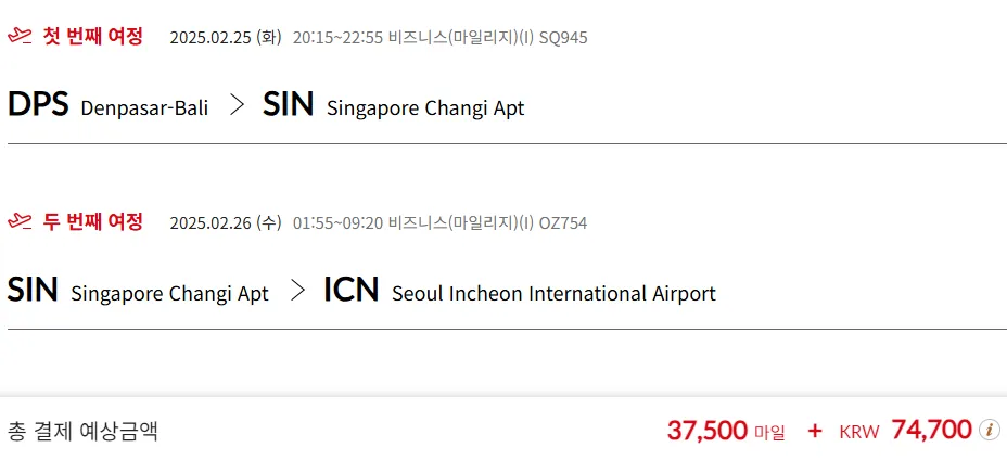 아시아나 마일리지로 발리를 비즈니스 타고, 단 시간에 가기는 정말 쉽지 않습니다. 소멸 예정 아시아나 마일리지가 있으시다면, 이코노미 좌석으로 발리는 싱가포르 경유해서 발권하세요. 대신 싱가포르에서 24시간 이내로 머물면서 싱가포르 마리나베이 구경하시길 추천드립니다.