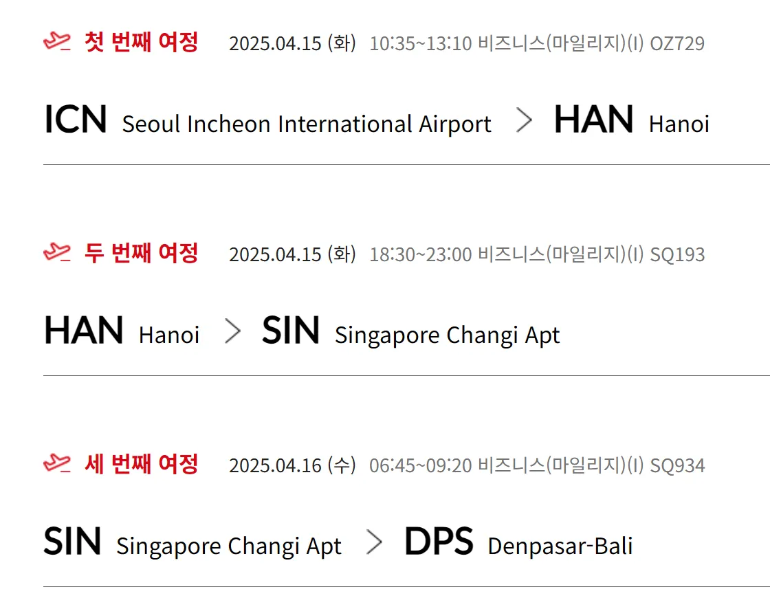 ▶ ⑤ 인천(ICN) → 호치민(SGN) → 싱가포르(SIN) → 발리(DPS) : 13시간