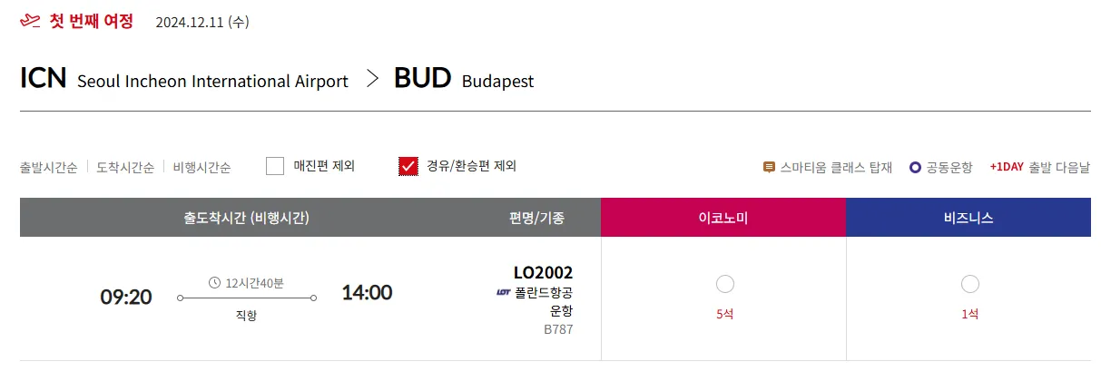 - (LOT 항공) ICN → BUD : 1석