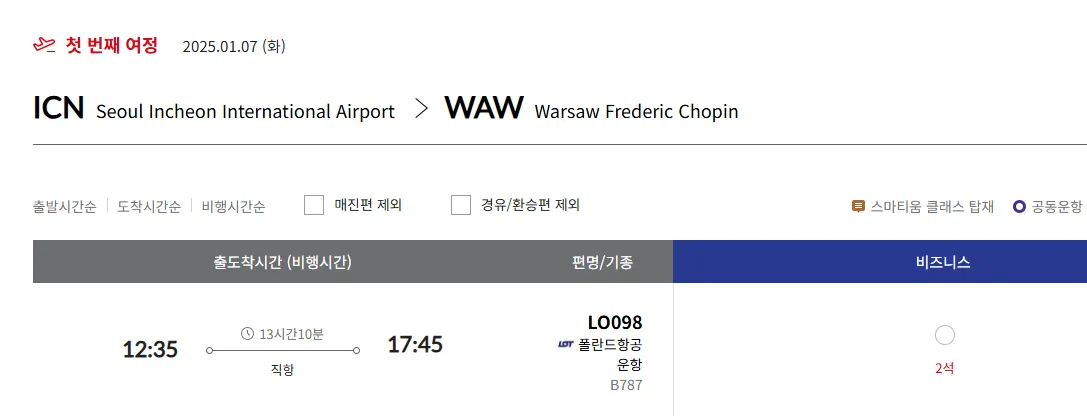 - (LOT 항공) ICN → WAW : 2석