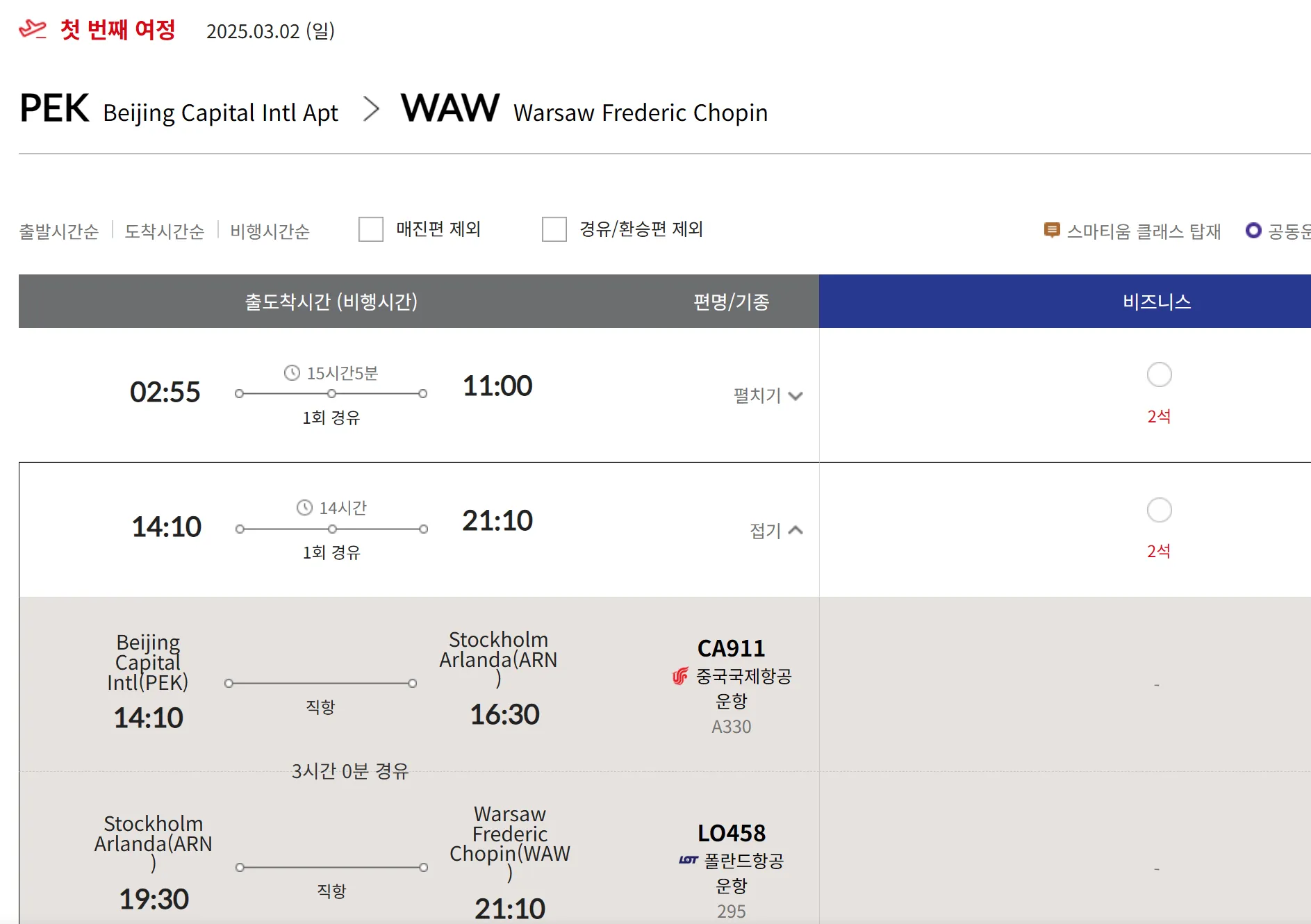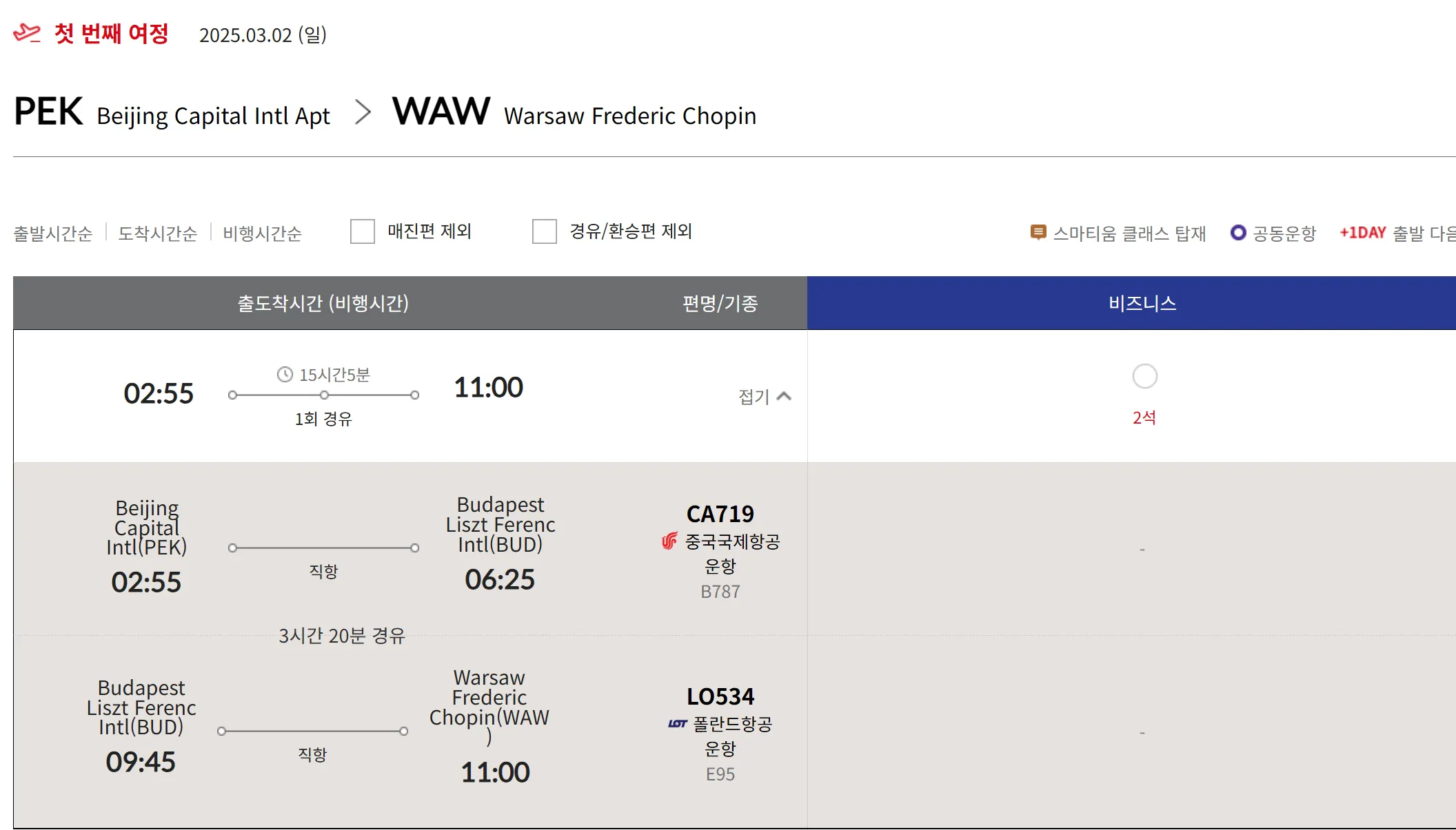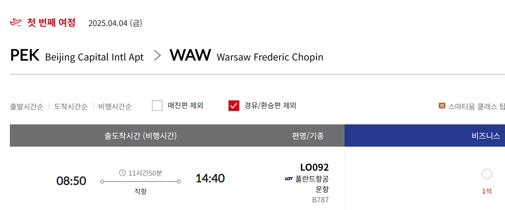 - (취리히항공) PEK → WAW(바르샤바) : 1석