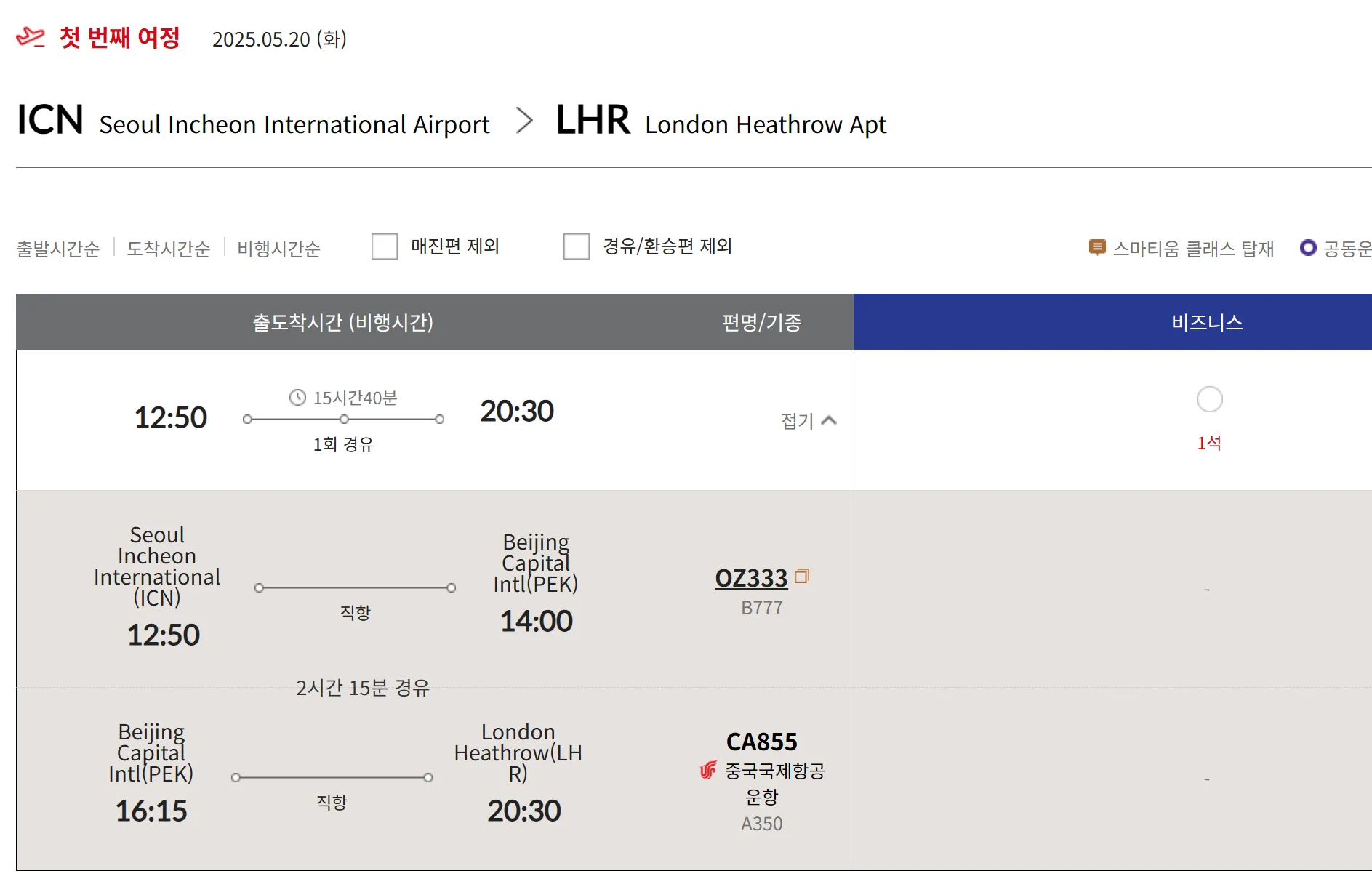 2025년 5월 20일(화) PEK(베이징) → LHR 로 검색하면 조회 되지 않지만….