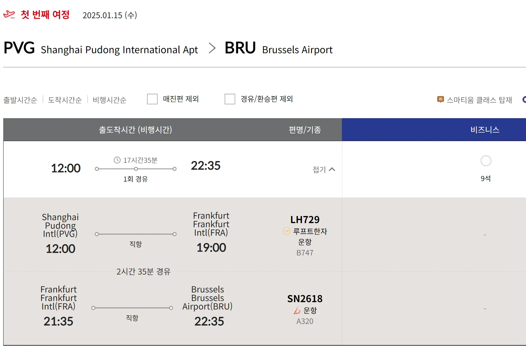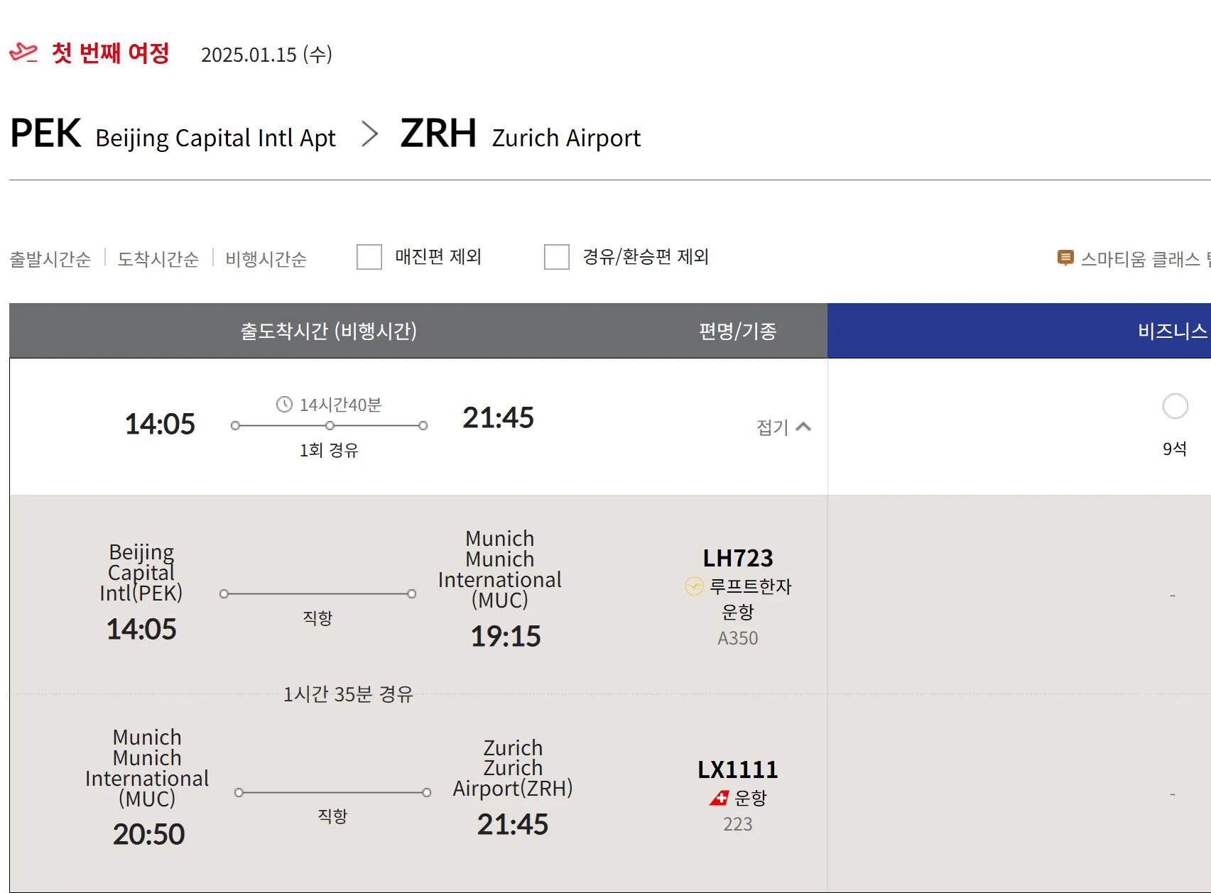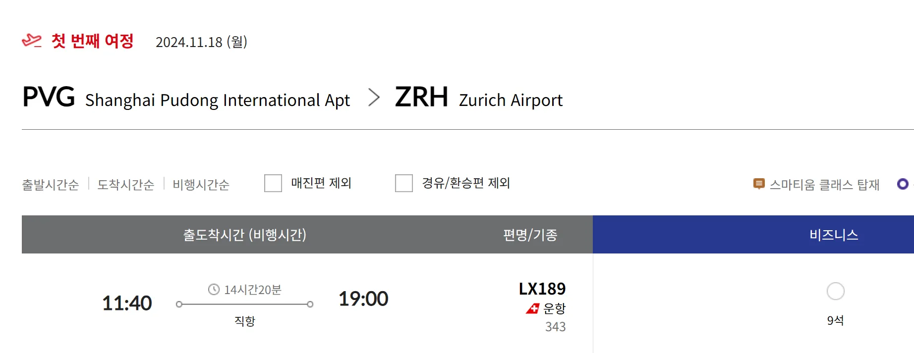 - (취리히항공) PVG → ZRH(취리히) : 9석