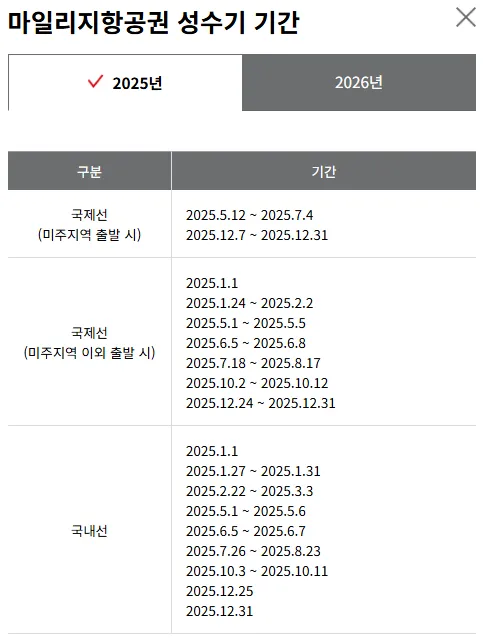 - 한국을 경유하는 이원구간의 경우 편도별 첫 여정의 탑승일을 기준으로 성/평수기가 결정되며 탑승클래스가 다를 경우 최상위 클래스 기준으로 공제 됩니다.