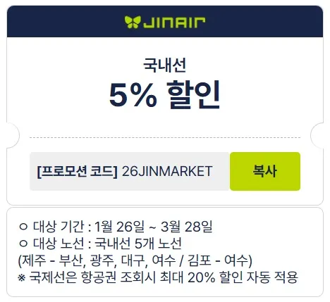 국내선 할인 코드: 26JINMARKET